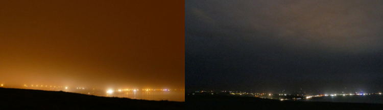 The post-retrofit photo shows the major advantages of the new horizontally shielded LED luminaires. The upward light escape is essentially eliminated, and this has removed the night sky pollution as well as the reflected light scatter from the sea.