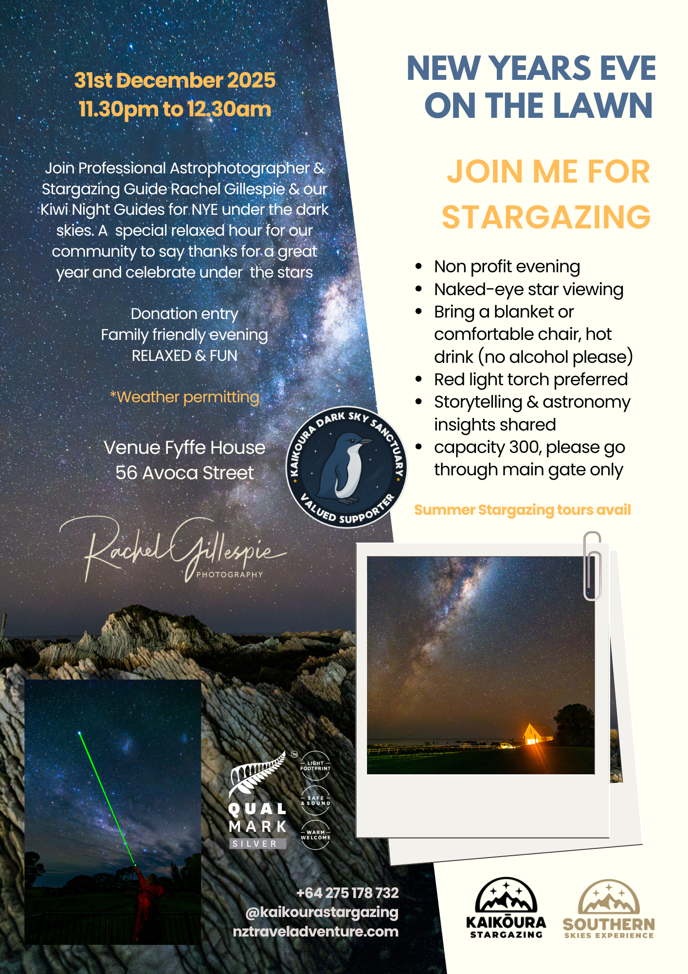 Read more: New Years Eve On The LawnCome together to celebrate the New Year under the stars. Kaikoura Stargazing are operating a community night sky event from 11.30pm on 31st December 2025 on the lawn of Fyffe …